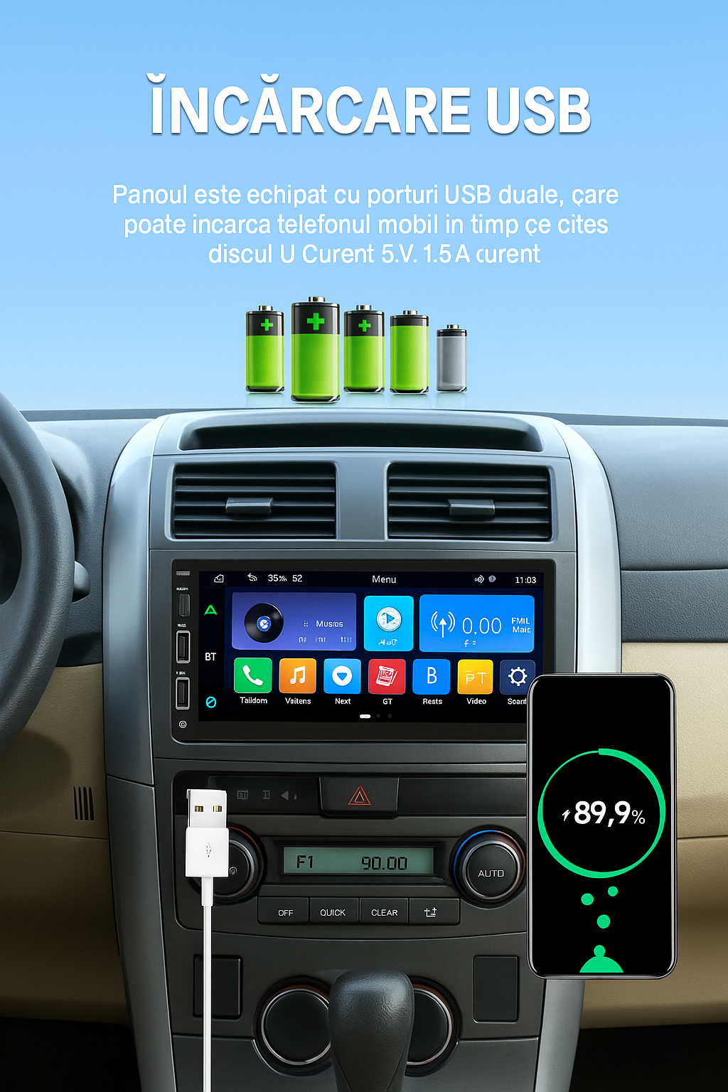 ● USB multifuncțional: Suportă redare audio prin USB și încărcare telefon cu curent de 2.1A.