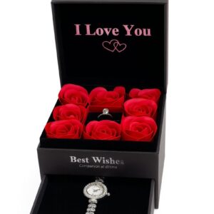 Set cadou Luxury cu trandafiri din săpun, ceas și inel reglabil, creat pentru a impresiona prin eleganță, funcționalitate și atenție la detalii. Acest set exclusivist conține 8 trandafiri roșii din săpun parfumat, un ceas de damă și un inel reglabil, toate integrate într-o cutie premium cu sertar, special concepută pentru o prezentare spectaculoasă.