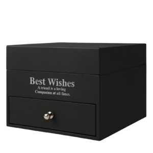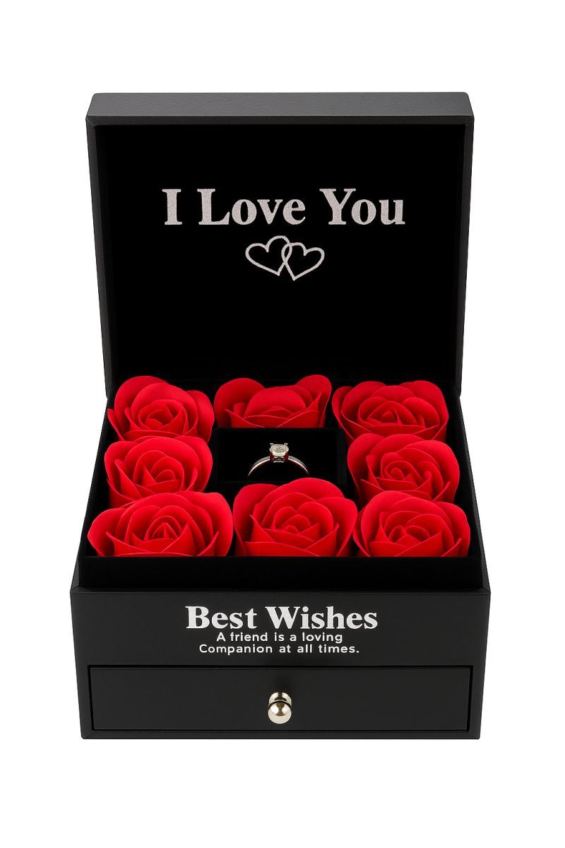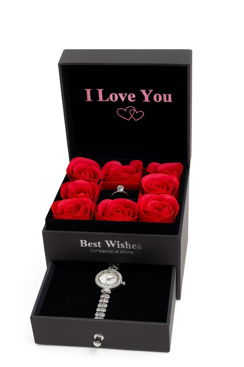 Aranjamentul floral este amplasat în compartimentul superior, în timp ce sertarul inferior adăpostește ceasul de damă, oferind un efect „wow” la deschidere. Inelul reglabil este inclus în pachet, completând perfect setul și transformând cadoul într-o alegere completă, gata de oferit.