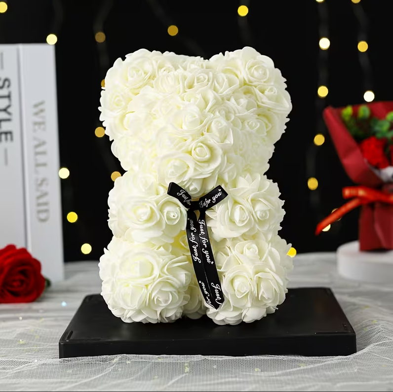 Ursuleț din trandafiri artificiali, realizat manual din flori de spumă premium, conceput pentru a oferi un cadou elegant, simbolic și plin de emoție. Designul său delicat îmbină frumusețea trandafirilor cu mesajul tandru al unui ursuleț, transformând fiecare moment într-o amintire specială.